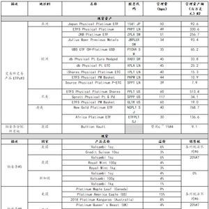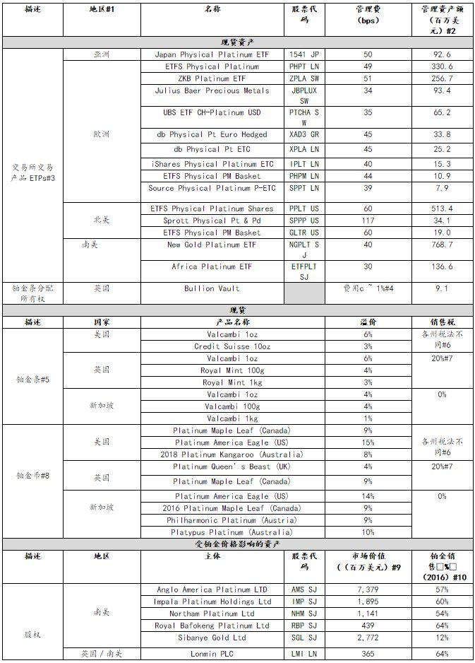 来源:彭博咨询、WPIC研究、BullionVault、goldsilvercentral.com、apmex.com、royalmintbullion.com、jmbullion.com. 1. 指金融产品挂牌所在地区,而不是投资者居住地;2. 2017年10月26日所示管理资产额(AuM);3. 交易所交易产品(ETPs)包括持仓量超过5千盎司的铂金;4. Bullion Vault费用包括: 0.5%的佣金和0.48%的存储和保险费用;5. 仅限于铸造铂金条,溢价计算基于每个铂金条价格(按每盎司算)vs 2017年10月25日现货铂价;6. 美国铂金条/币的销售税基于其产品销售州,很多州采纳0税收;7. 仅在实际到货的情况下支付增值税(VAT),而英国皇家铸币厂(Royal Mint)金库持有的铂金条和铂金币不征收增值税;8. 所示铂金币指2017年版1oz,除特殊备注以外;溢价计算基于每一个铂金币购置vs 2017年10月25日现货铂价; 9. 按2017年10月26日所示市值;10. 按2016年财年实际报道的收益。