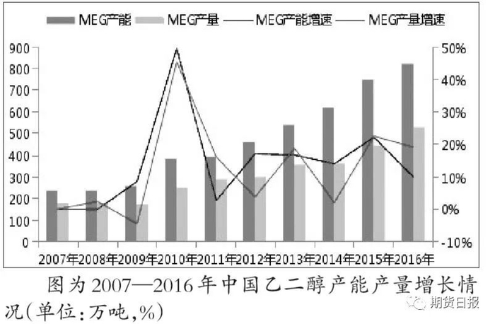 从2007—2016年中国乙二醇产能、产量增长情况来看,增速波动比较大,2007年产能为200万吨左右,2010年之后产能增长率相对平稳,2016年生产能力达到823.5万吨。