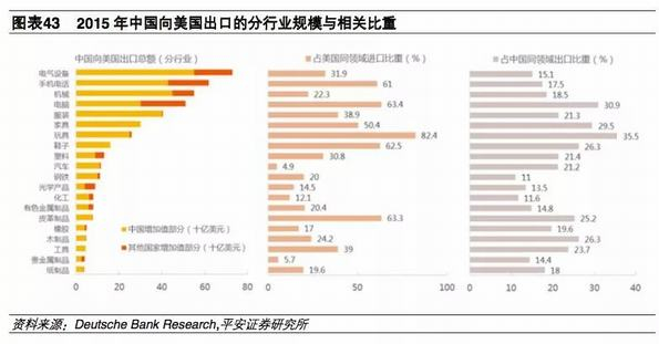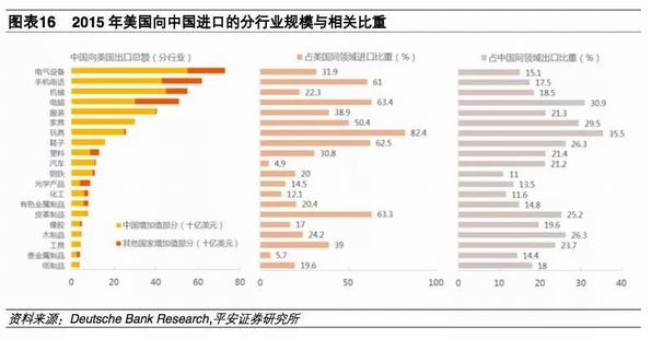 从中国对美国出口的分行业规模看,电气设备、手机电话、机械、电脑、服装、家具、玩具、鞋子、塑料、汽车、钢铁、光学产品、化工、有色金属制品、皮革制品、橡胶、木制品、工具、贵金属制品、纸制品等按规模依次递减,且以上行业出口总额里中国增加值都可以占到50%以上。其中服装、家具、玩具、鞋子、汽车、钢铁、皮革制品、木制品、工具和纸制品的中国增加值占比接近100%的水平。