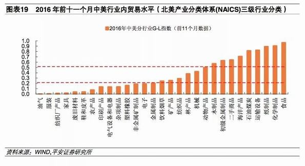 我们利用格鲁贝尔-劳埃德指数(即G-L指数)来衡量中美两国间的产业内贸易水平,由于产业内贸易水平越高意味着两国在该产业的关联度越强,所以我们在将中美贸易按北美产业分类体系(NAICS)三级行业分类后,根据原始数据测算中美贸易分行业的G-L指数后,按由低到高的顺序将各行业进行排列,G-L指数越低的行业,美国制裁时越能够达到利己的目的。