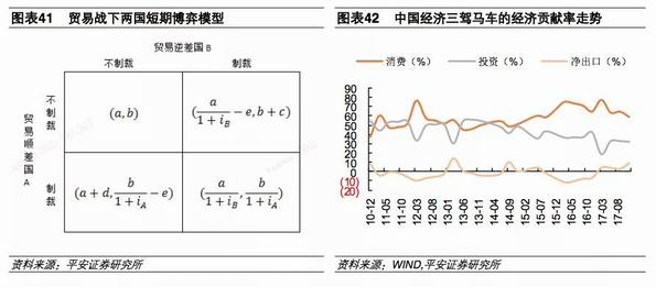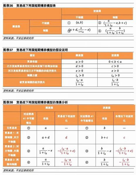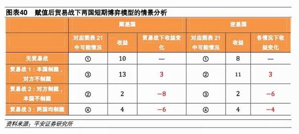 我们构建一个简单的贸易战下二元短期博弈模型(如图表21),来对贸易战双方的短期博弈行为及收益进行分析。