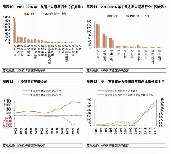 根据2015年与2016年前十一个月的数据,可以看出中美进出口贸易顺差规模较大的行业依次为电子、电气设备(含家电)、纺织服装、机械、家具、鞋及皮革品、钢铁、有色金属制品、塑料橡胶、非金属矿制品、化学制品、印刷品和木制品等。中美进出口贸易逆差规模较大的行业依次为农产品、运输设备(汽车、飞机等)、废旧材料、油气、矿产品和林产品等。整体看,中美进出口贸易顺差较明显,其中工业制造领域中美贸易存较大规模顺差,农产品领域则为显著逆差。