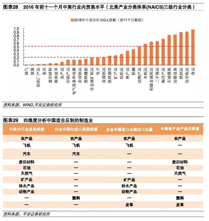 综合中美分行业贸易逆差规模、中国分行业进口美国产品规模、中国分行业进口美国产品值占美国该领域出口值比重及中美各产业的产品关联度等四个维度,我们认为中国在农产品(种子、水果、棉花、谷物等)与飞机等领域进行贸易反制能够显著增加美国进行贸易战的成本,另外中国还可以选择在汽车、废旧材料、石油、天然气、矿产品、林木产品、塑料、皮革及冷冻肉等领域进行贸易反制。除制造业外,在旅游等服务贸易逆差较大的领域进行反制也可以作为备选方案。