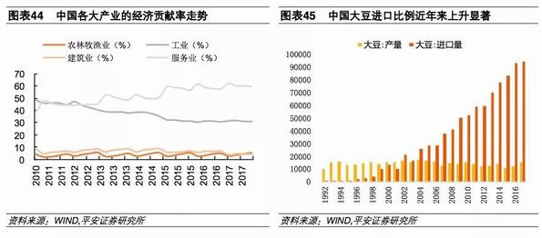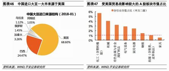 另外,中美贸易战一旦升级,由于中国可采取的贸易反制手段多分布于农产品及油气、矿产、林木等原材料领域,且中国在大豆等农产品领域进口比例较高且主要依赖美国的进口,所以这些反制手段或造成上述领域产品价格的显著上涨,考虑到农产品价格对通胀的影响,贸易战升级或将显著抬升中国的通胀水平。