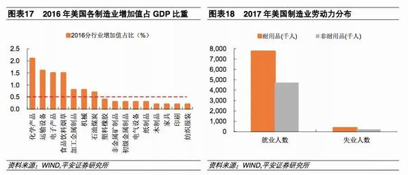 从行业增加值来看,美国的化学产品、运输设备、电子、食品饮料及烟草、金属加工制造、机械和石油煤炭的增加值占GDP比重超过0.5%,规模较大。塑料橡胶、非金属矿制品、初级金属制品、电气设备、纸制品、木制品、家具、印刷及纺织服装等行业的增加值占比虽为0.2%-0.5%,但尚具一定规模。