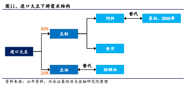 大豆价格上涨利好国内豆粕、豆油价格上行。国内进口大豆主要用于压榨,出粕、油率分别约为80%、20%,豆粕下游主要作为饲料蛋白成分,豆油主要用于居民食用消费。豆粕方面,国内豆粕年产量约为7550万吨,消费主要以自产为主,进口占比极低,替代品DDGS以及菜粕、棉粕等产量较小,难以对豆粕产生有效需求替代,豆粕价格主要由大豆价格主导,有望上涨;豆油方面,下游消费较为稳定,大豆价格上涨将抬高豆油成本,利好豆油价格,但由于豆油与棕榈油在消费端可以相互替代且棕榈油供给回升价格弱运行,豆油价格预计上行幅度有限。