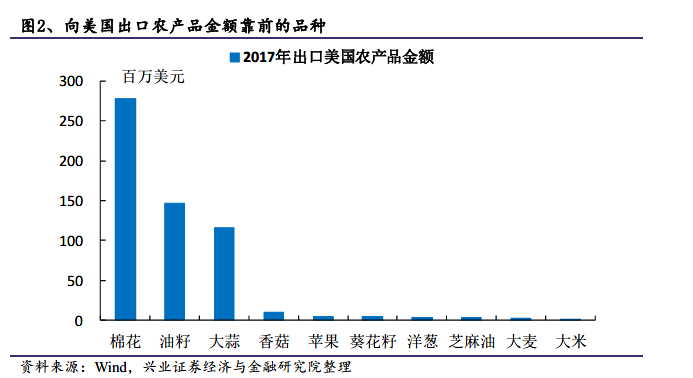 同时,我们也列出中国向美国出口金额较大的农产品,假如贸易摩擦升级,可能会受到波及。2017年中国向美国出口的主要农产品包括:棉花2.8亿美元,油籽1.5亿美元,大蒜1.2亿美元,香菇0.1亿美元。