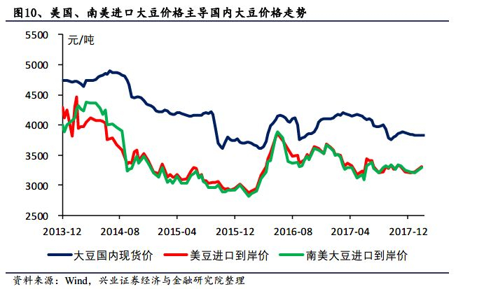 目前我国大豆进口关税3%,国内价格由进口价格主导。目前国内大豆进口关税3%,由于国际大豆是国内主要大豆供给来源,进口价格主导国内价格,走势高度一致。