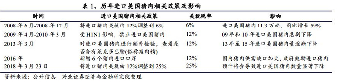 2018年3月以后,猪肉进口税率由12%增加至25%。3月23日,中国国家商务部发布了针对美国进口钢铁和铝产品232措施的中止减让产品清单,拟对自美进口部分产品加征关税,其中拟对美进口猪肉及制品征收25%关税。