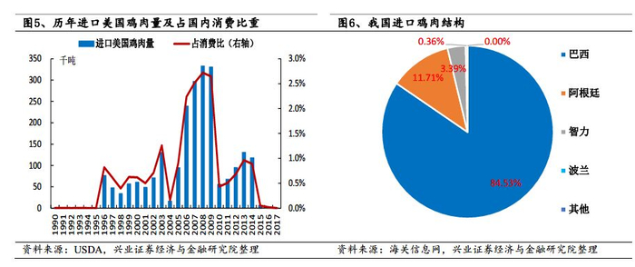 “双反”+禽流感双重影响,美国鸡肉进口量急剧下降。2010年以前,美国是我国最大的鸡肉进口国,2004-2009年,进口美国鸡肉占比不断增加,从42%上升到85%,进口美国鸡肉数量从7.6万吨增加至61.3万吨,年复合增速高达52%。2010年起,商务部对原产于美国的进口白羽肉鸡产品实施反倾销、反补贴措施,进口美国鸡肉数量迅速下降至仅有8.5万吨。2012-2013年进口数量有所恢复,但也不到2009年的一半水平。2014-2017年,受禽流感影响,我国关闭对美国鸡肉的进口,至今尚未放开。