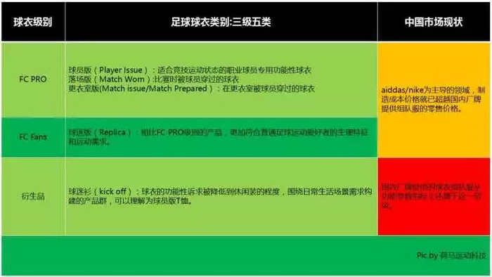 我们先从球衣说起。市场上流通的球衣分为三级五类,国内厂牌基本以提供组队服为主,功能性止步于衍生品这一层级。