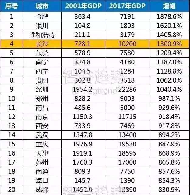 另外像长沙,从2001年的728.1亿增长到10200亿,跻身万亿俱乐部。