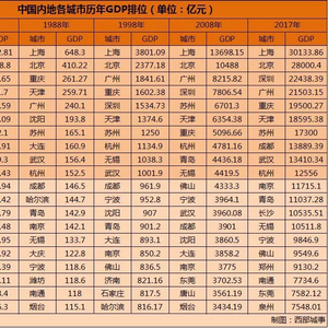 笔者对1978、1988、1998、2008以及2017年的全国经济二十强城市进行了梳理,为大家提供一个观察窗口。具体如上图所示,部分数据可能存在误差。