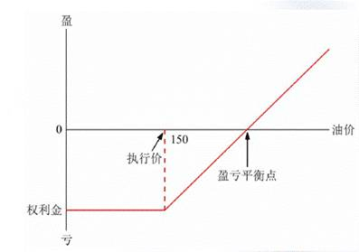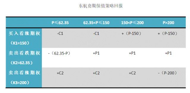 也就是说,东航处于主动方,当油价P大于150美元/桶,东航选择行权,向对手方以150美元/桶的价格买入航油,盈利(P-150)美元/桶。若油价位于(62.35-150)美元/桶区间,东航即可行权,也可以不行权,亏损,都为权利金。若油价P小于62.35美元/桶,东航选择不行权,支付给合约对手权利金。