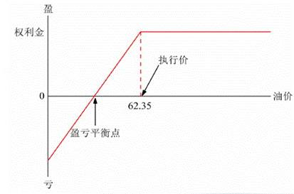 若合约价格P大于62.35美元/桶,合约对手可以选择不行权,东航获得权利金。弱油价小于62.35美元/桶,合约对手选择行权,东航以62.35美元/桶的价格向合约对手购买航油,东航亏损62.35-P(美元/桶)。