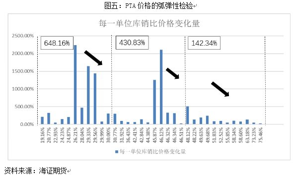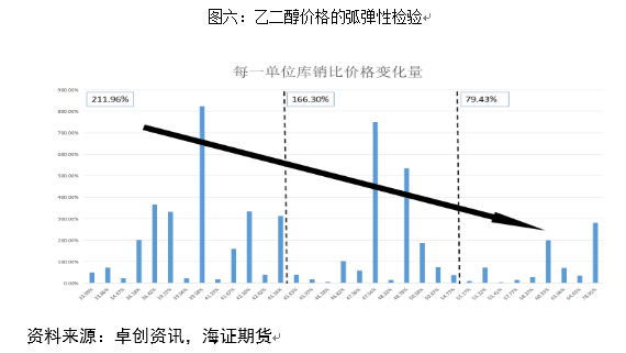 如图五所示,我们将PTA每一单位库销比价格的变化量测算出来,并且结合每一个值所对应的库销比水平进行升序排列。从图中我们可以直观的看到,在库销比相对较高的情况下,价格的弹性相对较低。并且在库销比无限大的情况下,价格的弹性均值基本接近于100%,即一单位每库销比引起的价格变动也是一个单位。反之,我们发现当库销比无限小的情况下,价格的弹性均值就相应的被无限放大。这一规律,同样在乙二醇上也得到了验证。(如图六所示)
