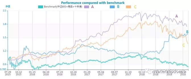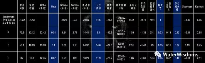 基金B虽然和基准指数保持低beta,低下行相关性,以及Skewness为正,相对于中国资产体现了很好的风险分散和下行保护功能;但由于(据说)主要覆盖国外资产,与另外两家不具备可比性。如果要做更科学的评估,需要更一线的调研,和其覆盖的资产作比较。