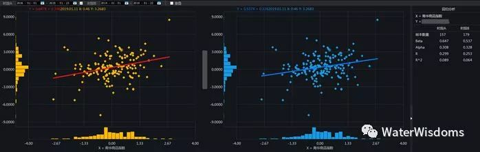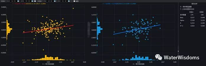 由于(股+债+商品)的基准指数是混合的资产,基准指数的子资产之间的波动不同步隐藏了一些风险,所以研判宏观基金更科学的做法是—— 对同一只基金,我们也要拆解它和各个大类资产的相关性。比如上面样本中一家基金,我们发现和沪深300指数和南华商品指数都保持了较高的相关性。这显然与前面Research Affiliates 研判的宏观基金与股,债,商品等各个资产之间的相关性都低于0.3还有一段差距。