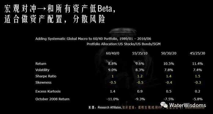由于宏观对冲具备在熊市中或黑天鹅中创造正收益的特性,它又可以给FOF提供一个下行保护;而且由于它在牛市中也可以实现正收益,宏观对冲实际给资产配置者提供了一个内含廉价的看跌期权的选项 —— 在牛市中不大幅拖累FOF组合,在熊市中又可以增加收益,优化FOF的Skewness —— 抗黑天鹅能力。