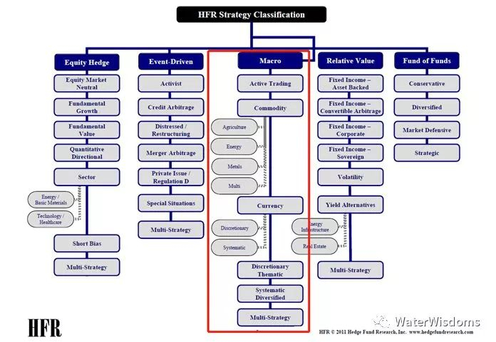HFRI把宏观策略分为6个子策略(我们可以看到,HFRI把CTA也归入了宏观子策略,我们对此略有不同意见,今后有机会再详细探讨):