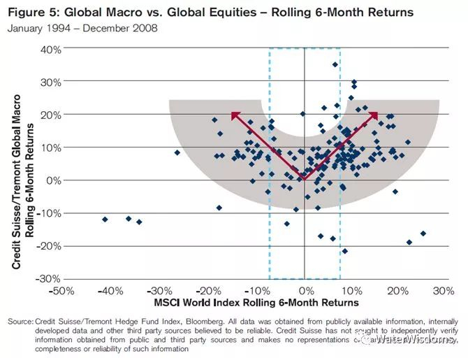 根据瑞士信贷的基于1994-2008的数据统计,宏观对冲的6个月滚动业绩在MSCI World Index涨跌情况下,都实现正收益,呈非线性关系。