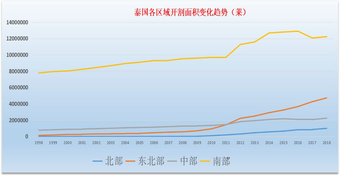2010-2012年,全球天胶新种面积尤其大,远远超过了之前10年的水平。2011年之后,随着中国逐步进入L型经济,全球天胶需求增长放缓;而反观供应一方,2000年之后栽种的橡胶树开始产胶,天胶开割面积不断大量释放。按照栽种后7年开始产胶的规律计算,开割面积的释放一直要持续到2019年。由于2010-2012年庞大的新种面积,2017-2019年3年开割面积的增幅也将殊为可观。由于全球天胶供需格局由供不应求转向供大于求,因此,2011年天胶价格也从牛市转入熊市。