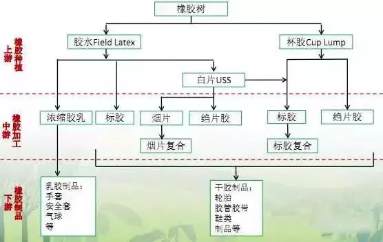 在开始这部分之前,先从一张图了解一下,橡胶从牛奶一样的白色液体,变成各式各样的工业品,当中经历了怎样的“七十二变”:
