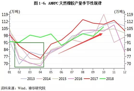 图上也可以看出,虽然一年12个月都有橡胶出产,但由于停割期的存在,不同的时间内橡胶产量是不一样的。