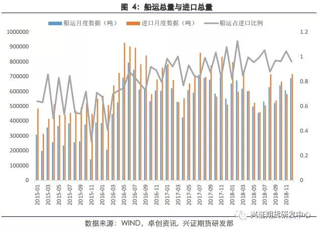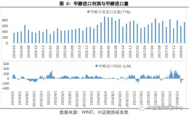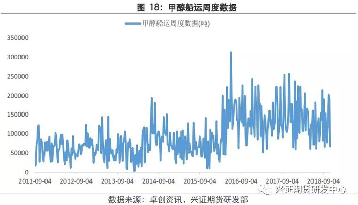 从逻辑来解释,当进口利润为负时,进口商进口无利可图,从而即使船运到港,贸易商也不会选择报关,而是更倾向于进行转港贸易,转口至其他地区;因此当甲醇的进口利润为负时,进口数量也会相应减少。从下图也能证明我们的观点,2014年的3~4月以及9~10月进口利润为负的时候,那段时间的船运到港数量高于当时海关统计的实际进口量。