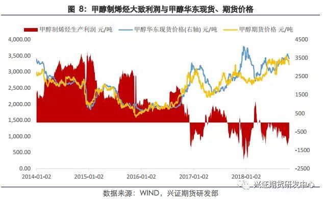 我们认为若当期甲醇开工率上升,且当期甲醇制烯烃开工率下降,则甲醇供给压力大于烯烃供给压力且甲醇需求有所下降,因此甲醇价格将弱于烯烃价格;同样若当期甲醇开工率下降,且当期甲醇制烯烃开工率上升,则甲醇供给压力小于烯烃供给压力且甲醇需求有所增加,因此甲醇价格将强于烯烃价格。
