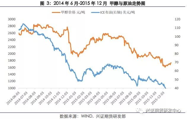 由于甲醇制烯烃,已经逐步成为甲醇最主要的下游,2018年甲醇制烯烃需求占甲醇下游需求一半左右,因此烯烃价格的变动会对甲醇价格产生较大的影响。然而我国烯烃生产又是以石化制烯烃为主,石化制烯烃占烯烃产量的比例在70%左右,因此原油价格波动会对烯烃价格产生明显的冲击,从而对甲醇价格产生影响。如下图所示,从2014年6月开始至2015年12月,ICE布油价格从110以上一路下跌至40元左右,跌幅超过50%,与此同时,甲醇合约价格也由最高2800元左右下跌至最低1600元,跌幅超过40%。2018年以来,随着国际形势变化加速,原油暴涨暴跌的频率越来越高,对国内甲醇价格的冲击也越发显著。