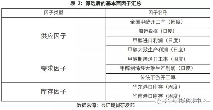 根据前文对于甲醇产业链基本面的梳理,我们将基本面因素分为供给、需求、库存三个方面,下面我们对这些因子进一步筛选处理,具体如下: