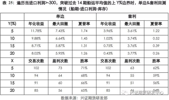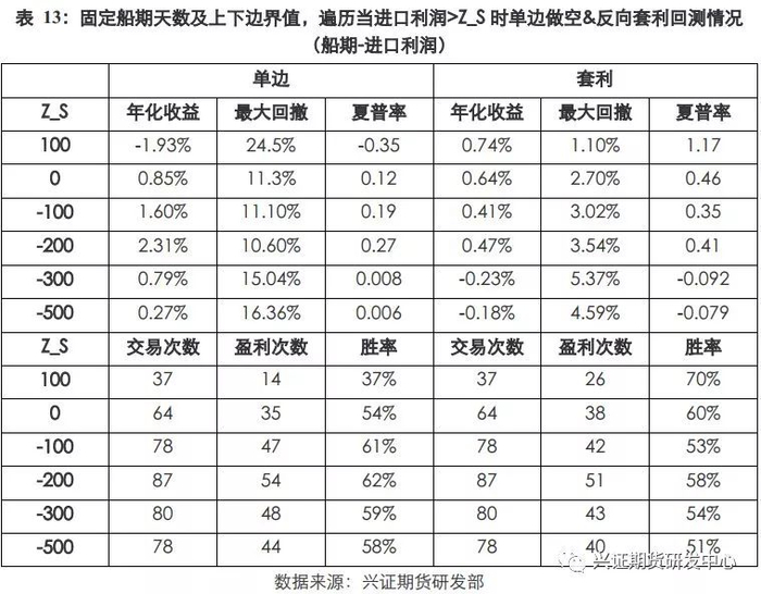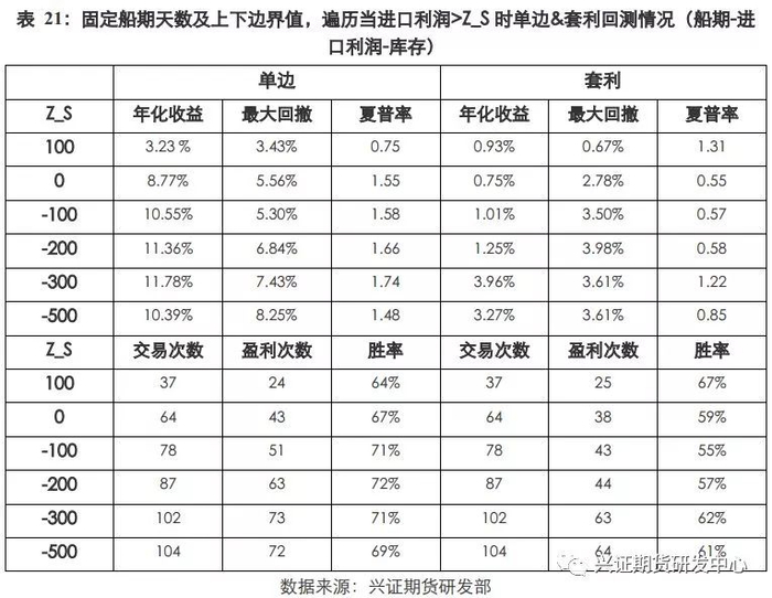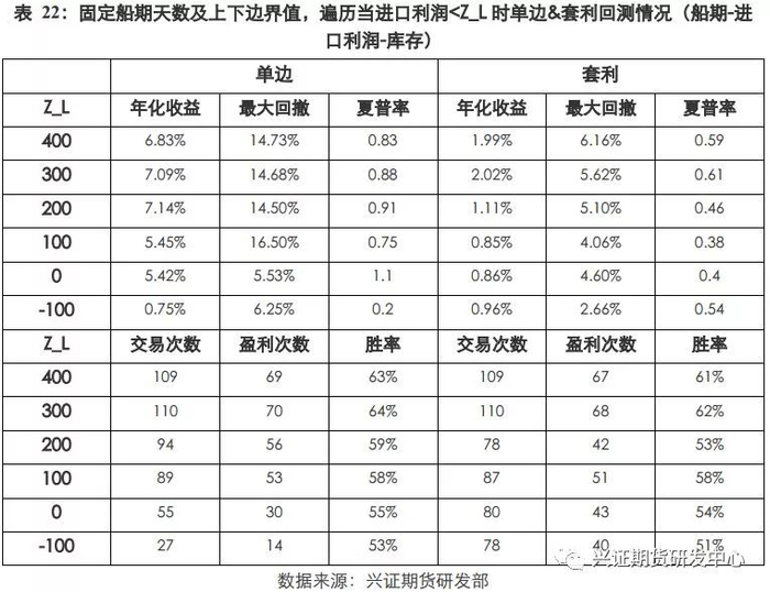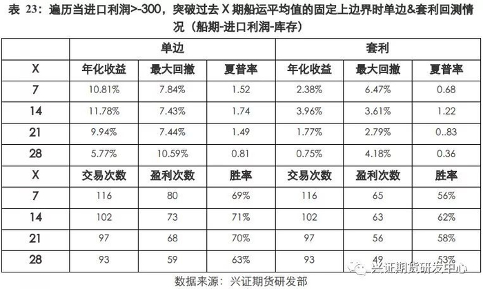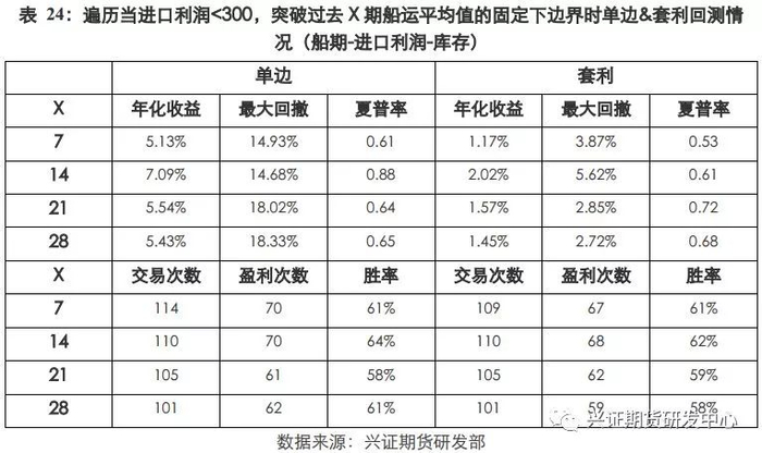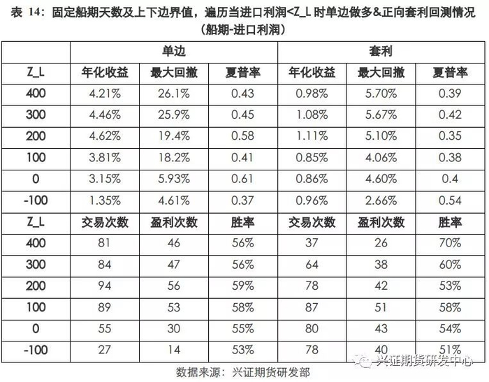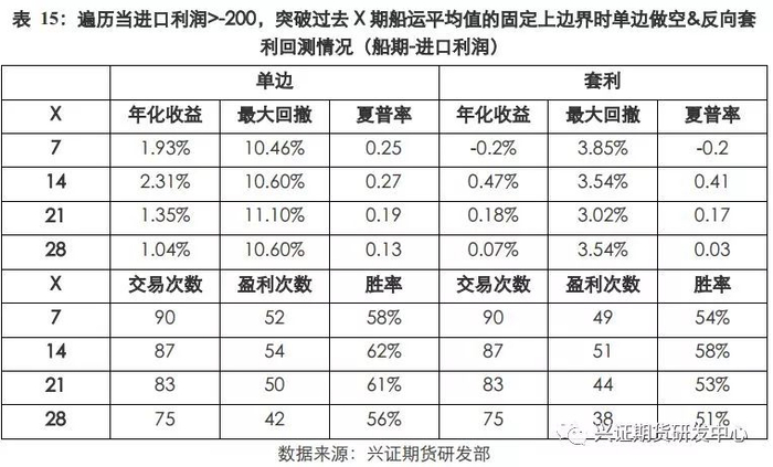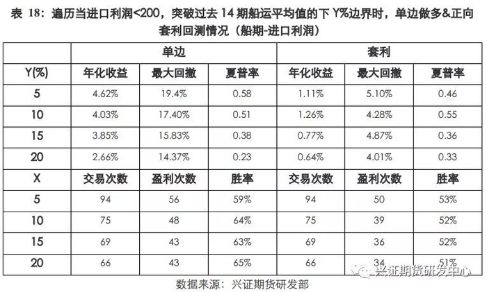 若当期船期突破过去14期船运平均值的5%下边界,我们判断船运此时偏低,加之若此时进口利润<200,则做多主力合约或买入近月合约-卖出远月合约。此时策略效果最好。