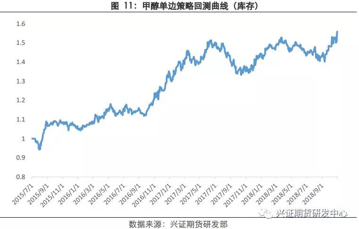 同时,我们发现叠加了甲醇库存因子,即从供需两方面分析甲醇价格时,策略效果较之前显著提升。其次发生最大回撤的时间在2015年的7月至8月,发生回撤的原因,主要是由于虽然当时船运数量较大,但当时国内甲醇需求良好,甲醇库存持续减少,甲醇基本面较好,但是受当时国际原油价格快速下跌拖累,烯烃价格弱势下行,从而导致甲醇价格震荡走低。因此我们在用基本面因子对单品种期货产品进行量化建模时,需要关注到宏观因子的干扰可能导致模型暂时性失效。