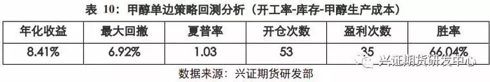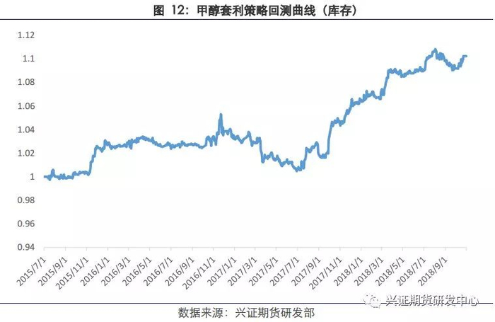 若当期船期突破过去14期船运平均值的5%下边界,且此时进口利润<300,若当期甲醇库存较上一次增加,则做空主力合约或卖出近月合约-买入远月合约;若当期库存较上一期减少,则做多主力合约或买入近月合约-卖出远月合约。此时我们发现策略效果最优。