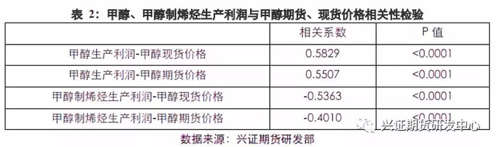 (2)我们将甲醇的生产利润、甲醇制烯烃的生产利润分别与甲醇的现货价格和甲醇的期货价格进行相关性检验。发现在1%的显著水平下,甲醇的生产利润与甲醇现货、期货价格呈现显著正相关;而甲醇制烯烃的生产利润与甲醇的现货、期货价格呈现显著负相关。这也符合我们前面的逻辑分析。