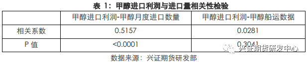 我们计算出进口利润因子与进口数量显著正相关,而进口利润因子与船运数量因子正相关不显著,因此可以同时利用利润因子与船运数量分析甲醇进口。我们对进口利润与甲醇的月度进口量数据、以及甲醇的船运数据进行了相关性检验,可以发现,在1%的显著水平下,进口利润与月度进口量呈现一个显著正相关;而甲醇的进口利润与甲醇的船运数据之间,则呈现一种不显著的正相关,因此我们可以同时使用船运数量因子和进口利润因子来分析甲醇进口情况。