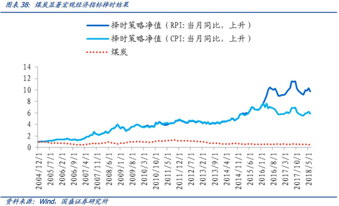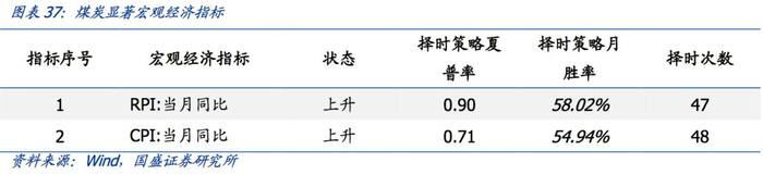 对煤炭行业择时效果最为显著的宏观经济指标如下,一个是RPI:当月同比,另一个是CPI:当月同比。当RPI和CPI上升时,煤炭行业有超额表现,反之煤炭行业表现较差。