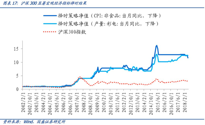 对于沪深300,有两个宏观经济指标的择时作用较为明显,第一个是CPI:非食品:当月同比,第二个是产量:彩电:当月同比。两个指标都经过了六个月移动平均的处理,且都宜在下降状态做多沪深300。