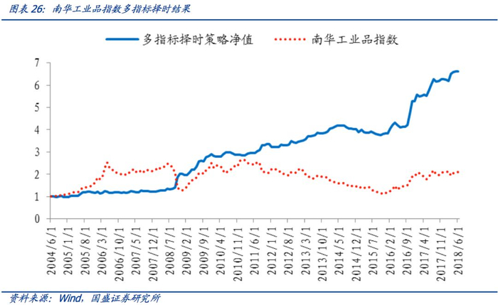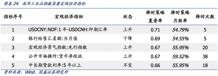 对南华工业品指数择时效果最显著的指标如下,每一个指标的预测效果都没有特别好,择时策略净值的夏普率都在0.6-0.7左右,择时胜率略高于50%,但是这一些宏观经济指标的状态相关性较低,将其简单等权结合就有效果的提升。从这些指标我们可以看到,工业品价格主要与汇率、宏观景气、货币、利率有关。