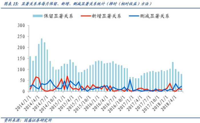 通过数据验证得到的显著关系本质上是统计上的结果,并不代表两者之间真的存在因果关系,因此需要防范其失效的风险,我们必须验证显著关系的持续性和稳定性。通过建立并跟踪显著关系库中关系的进入与退出,可以考察显著关系的稳定性。