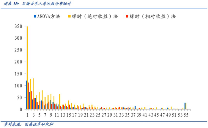 我们同时对每一条进入显著关系库的关系进行了跟踪,统计了其进入显著关系库的次数,大部分关系在显著关系库中保留的时间极短,但是也有不少的关系持续了整个考察期55个月,分布呈现出一定“厚尾”效应。其中ANOVA方法下有28条这样的关系,择时(绝对收益)方法下有26条这样的关系,择时(相对收益)方法下有2条这样的关系。这些关系在时间序列上的稳定性极强,其背后蕴含强宏观逻辑的概率较高。