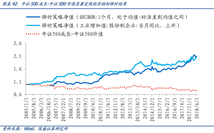 对中证500成长-中证500价值择时效果最为显著的宏观经济指标为SHIBOR:1个月和工业增加值:股份制企业:当月同比。在SHIBOR处于历史均值-标准差到均值之间的时候或者工业增加值上升的时候做多多空组合反之做空,能够分别将月胜率从47.48%提高到59.71%,从46.58%提高到57.14%。成长与价值的相对收益往往受到较多利率的影响。