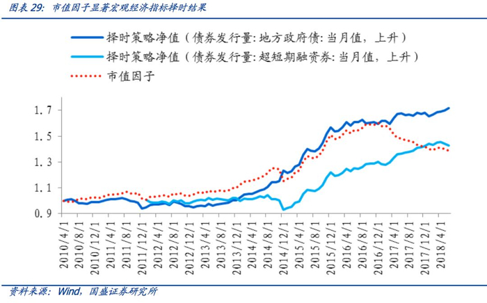 在本报告的检验过程中,对市值因子有一定择时作用的指标为债券发行量:地方政府债:当月值与债券发行量:超短期融资券:当月值,两个指标都做了12个月的移动平均,本质上与同比类似。