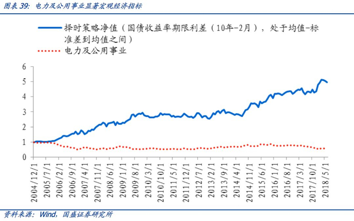 对电力及公用事业行业择时效果最为显著的宏观经济指标为国债收益率期限利差(10年-2月)。当期限利差处于历史均值-标准差到均值之间的时候做多电力及公用事业行业,其他时间做空电力及公用事业行业,能够将电力及公用事业行业的月胜率从47.53%提高到54.94%。