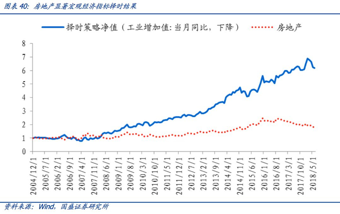 对房地产行业择时效果最为显著的宏观经济指标为工业增加值:当月同比。当工业增加值下降的时候做多房地产行业,其他时间做空房地产行业,能够将房地产行业的月胜率从51.02%提高到61.22%。