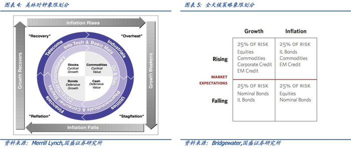 宏观指标的低频性导致了要获得足够的分析数据必须跨越较长的时间,从而由不同的政治、经济、文化环境导致的指标异方差特性比较明显,因而相比宏观指标的绝对值水平,投资者更为关注宏观指标的增量变化或者说趋势性。利用宏观指标的趋势状态划分经济活动周期是一种常见的分析方法。著名的美林时钟和全天候策略就是利用经济增长和通货膨胀的趋势对经济周期进行象限的划分,从而使得各个象限内的经济状况、政策倾向、资产价格共性更为突出,本质上这是利用附加条件提高概率的手段。