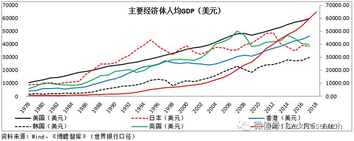 二十年以来,恰逢日本选装经济体陷阱经济增长困境的一段时期,中国大陆的经济总量由1.03万亿美元升至13.43万亿美元,人均GDP也由827美元升至近万亿美元,进步明显。