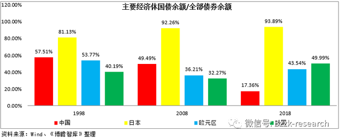 第四,中国国债在债券市场中的地位逐步下降,趋势上与主要经济体明显背离,1998年、2008年与2018年我国国债余额占比分别为57.51%、49.49%和17.36%,在主要经济体中处于绝对低位。