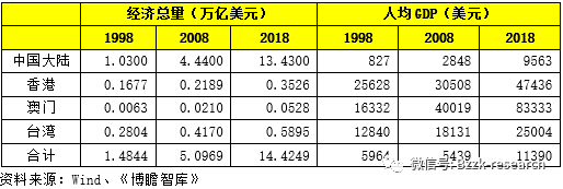 需要指出得是,前面所讨论的中国经济总量等问题并未将港澳台纳入,如果将港澳台纳入则意味着我们讨论范围延伸至大中华区。同样参照前述模式,我们重点聚焦1998年、2008年与2018年三个时间点。
